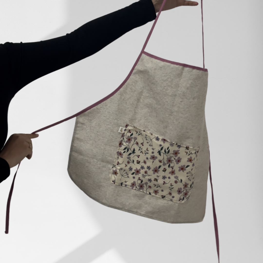 Éste modelo de DELANTAL Flores en Contraste de la colección Vintage Elegant, se diferencia de otros en su base color beige suave, lo que resalta el bolsillo de tela floral con tonos lilas y morados.