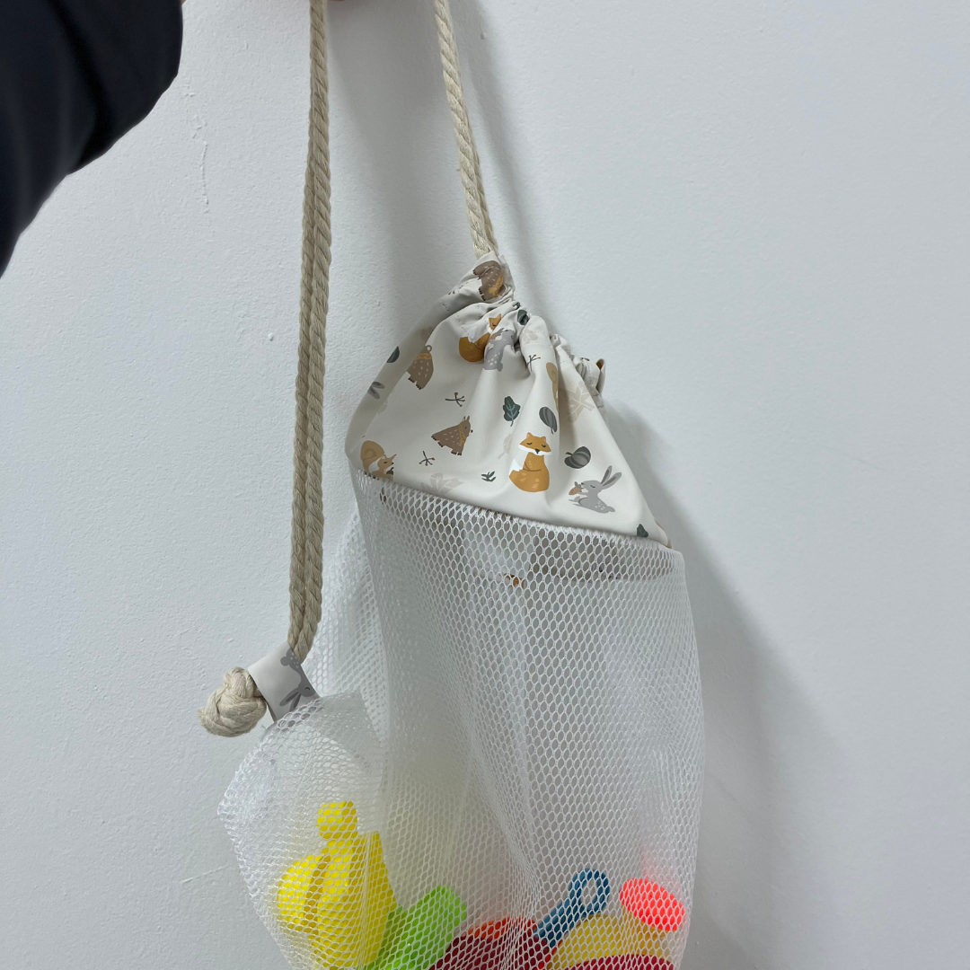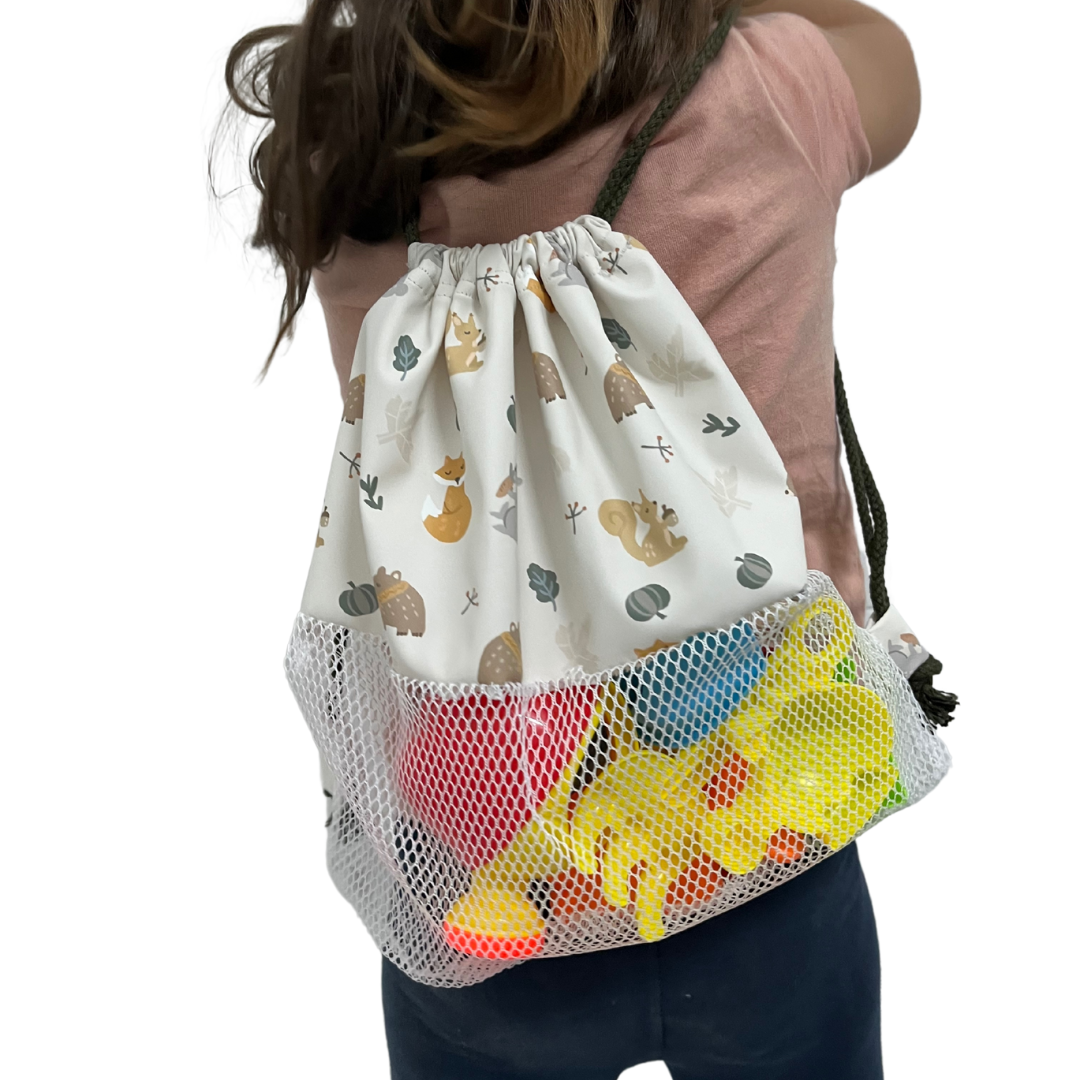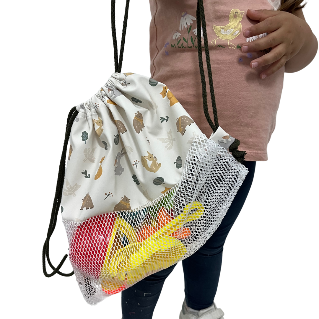 Forma tipo saco, ideal para llevar toallas, ropa de cambio, cubos, palas y todos los juguetes de exterior. Perfecta como bolsa multiusos o para dejar en la escuela infantil.