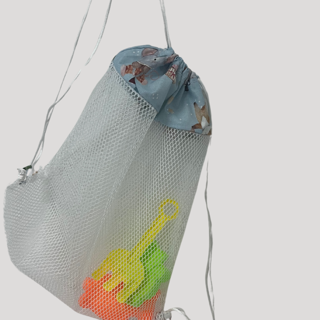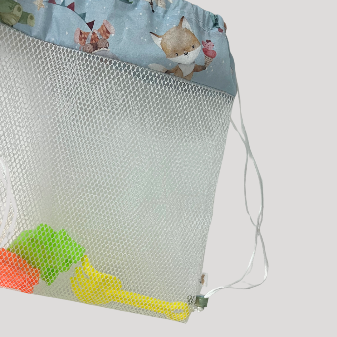 Forma tipo saco, ideal para llevar toallas, ropa de cambio, cubos, palas y todos los juguetes de exterior. Perfecta como bolsa multiusos.