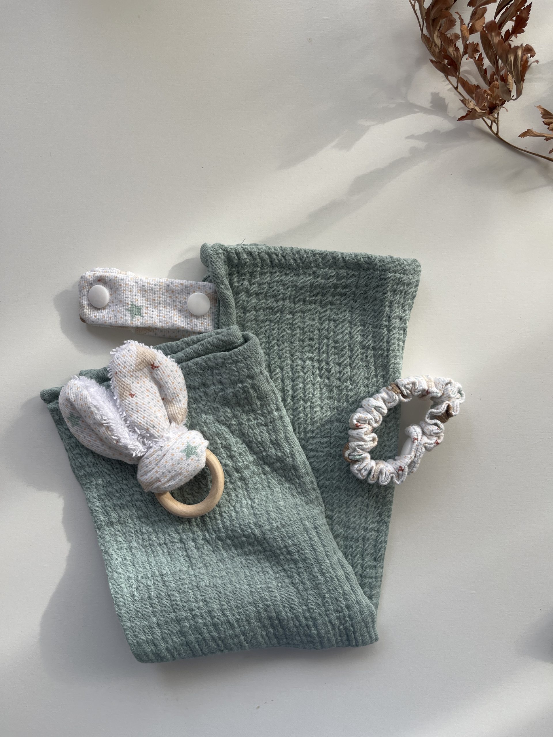Pulsera de lactancia + muselinas de lactancia + mordedor madera y tela