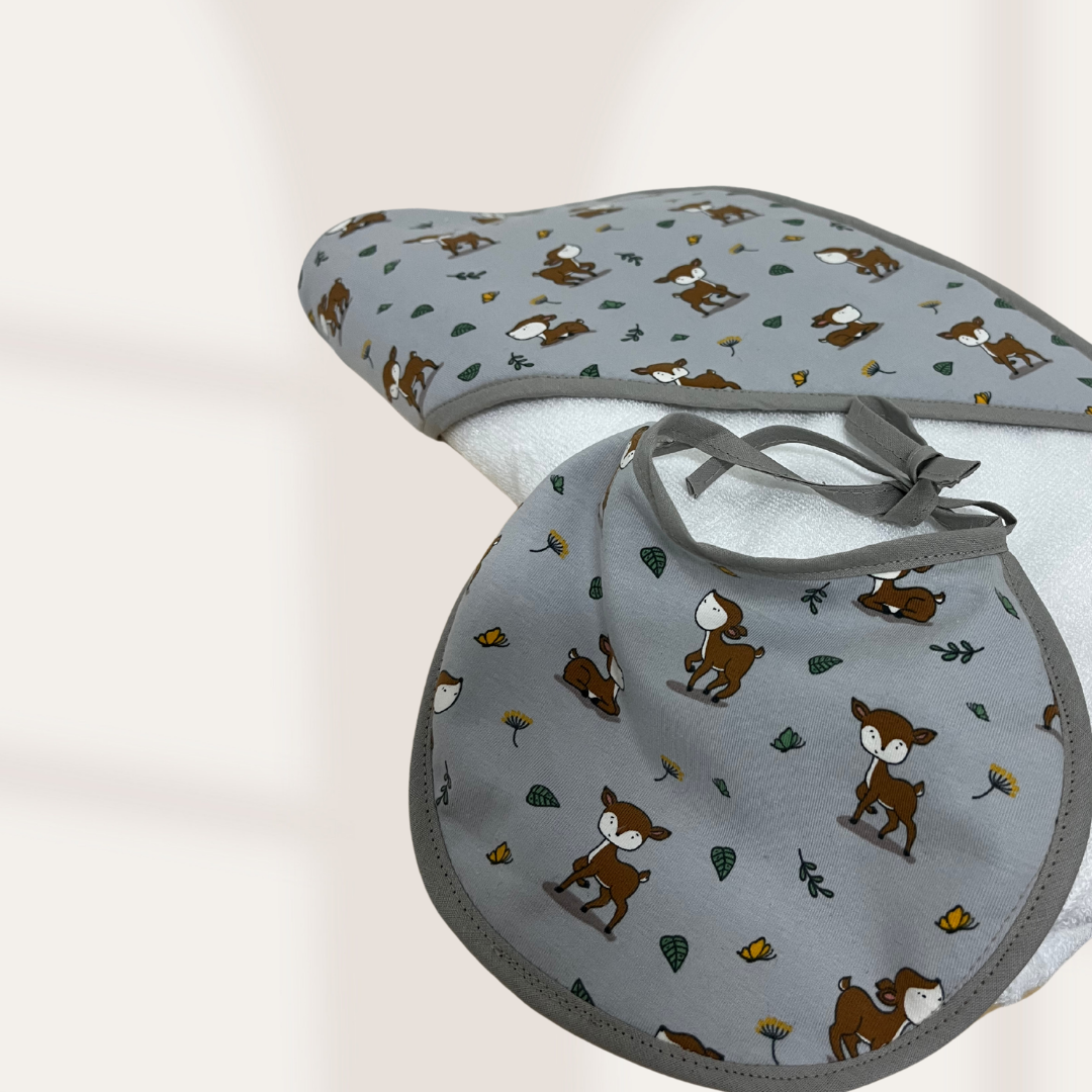Toalla infantil con capucha + Babero Confeccionada a mano en tela de rizo y estampado infantil